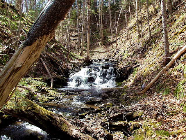 TRAIL DESCRIPTION: an old trail, recognized on my GPS topo map as an 'abandoned railline' makes a more or less undergrowth and snaggle free hike for more or less the entire hike to these falls. There are several spots along the low-lying portion of this brook that you have to jump over the stream, but it isn't a very wide watercourse. The LONG abandoned rail line eventually follows the second tributary of the North Branch of Campbell Brook, the main brook continues straight along the valley bottom. Along this tributary, at the head of the small valley, is where you will find these small, but charming, falls.